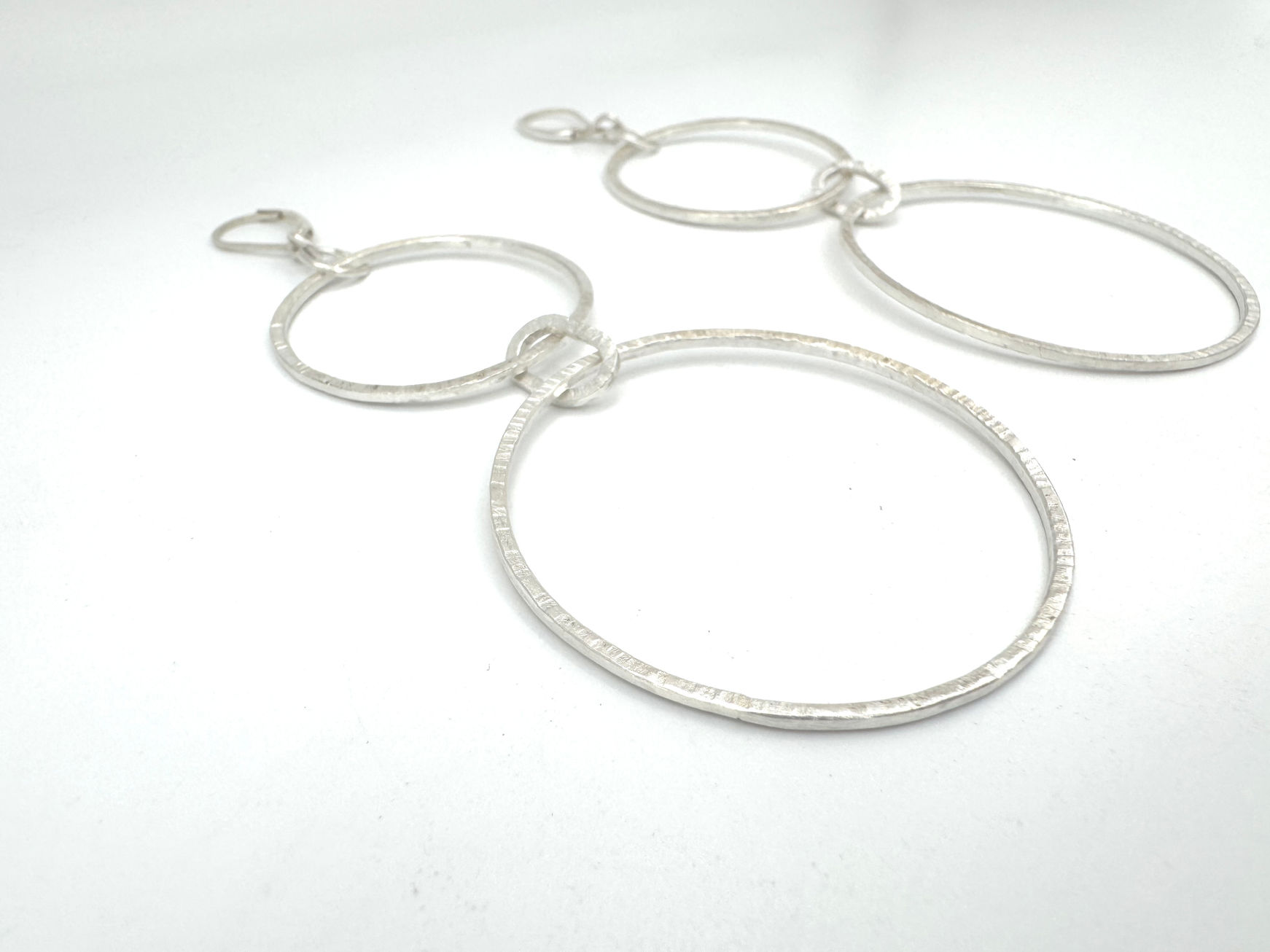 Deze Hoops zijn. handgemaakte zilveren dubbelen creolen oorbellen. De oorbellen zijn gemaakt van hoogwaardig sterlingzilver gemaakt. De oorbellen zijn mat en hebben een gehamerde afwerking. Bij het dragen bewegen ze sierlijk langs uw hoofd.