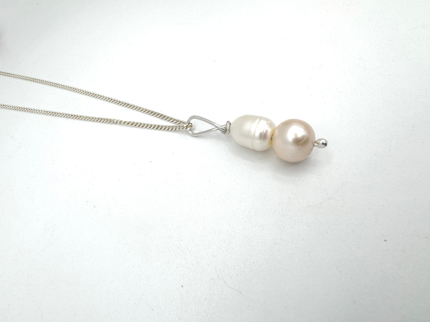 Handgemaakte unieke sterling zilveren hanger met twee prachtige natuurlijk glanzende zoetwaters boven elkaar.